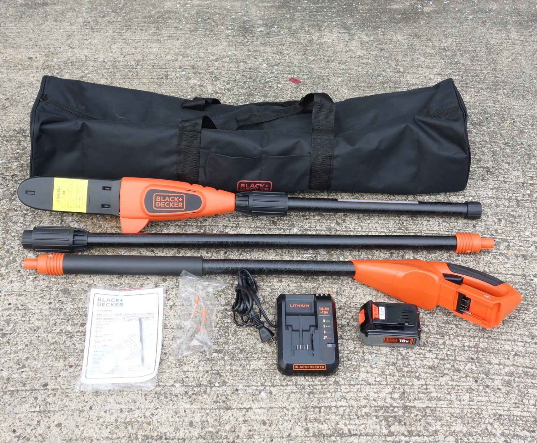 [送料無料] 美品◆ブラックアンドデッカー 18V コードレス 高枝 ポール チェーンソー 200mm GPC1840LN 充電器 バッテリー ソフトケース 付き チェンソー 電動 工具◆ |