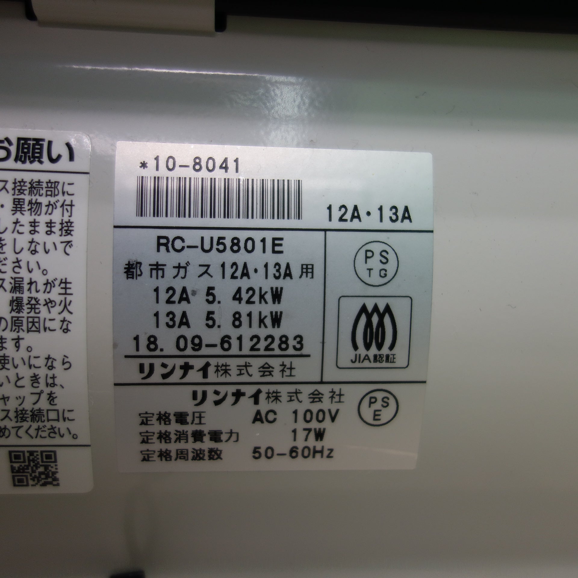 ガスファンヒーター RC-U5801E 都市ガス用 |