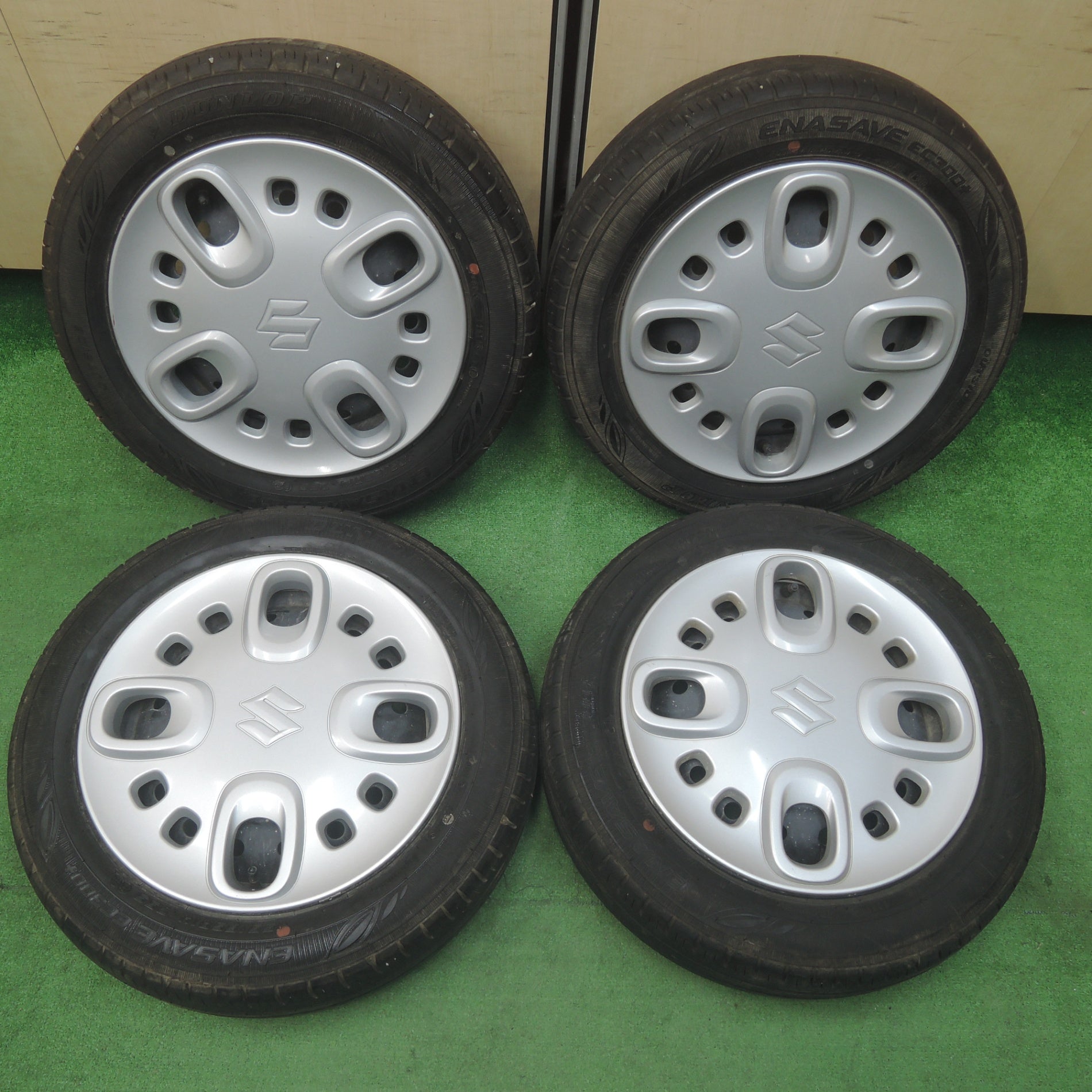 [送料無料] バリ溝!キレイ!8.5分★スズキ スペーシア 純正 スチール 155/65R14 ダンロップ エナセーブ EC300+ 14インチ PCD100/4H★4020212SYノ |
