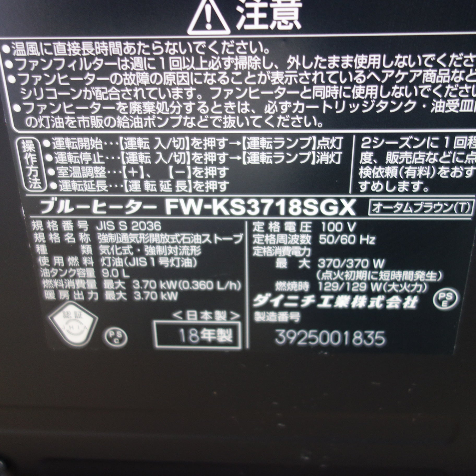 [送料無料] ☆DAINICHI ダイニチ 石油 ファンヒーター FW-3718SGX 暖房 10畳~13畳 9.0L 2018年製 家電 空調 省エネ☆ |